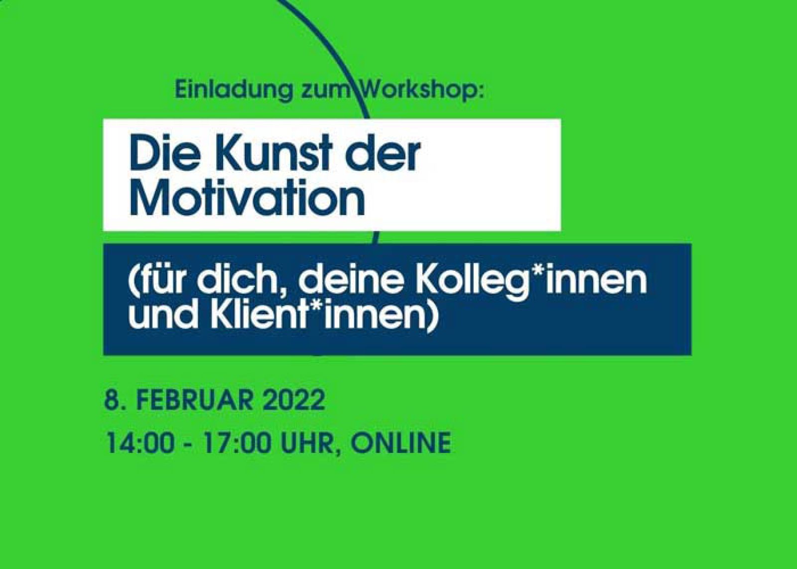 Nach einem aufschlussreichen und motivierenden Workshop am 17.1. zum Thema “Bewegung & Begegnung” (Video-Extrakt hier), möchten wir euch nun recht herzlich zu unserem 2. online Workshop “Die Kunst der Motivation (für dich, deine Kolleg*innen und Klient*innen)” am 8.2.2022, 14 -17 Uhr einladen.
